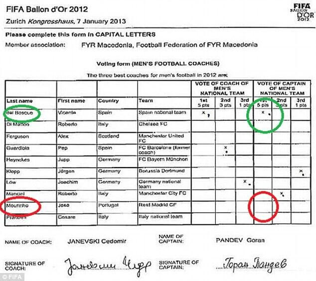 Η FIFA, η οποία συνδιοργανώνει τα βραβεία μαζί με το γαλλικό αθλητικό περιοδικό “France Football”, έδωσε στη δημοσιότητα την καρτέλα που αντιστοιχούσε στις ψήφους της ΠΓΔΜ και φαινόταν ξεκάθαρα ότι η ψήφος του Πάντεφ πήγαινε στον Ντελ Μπόσκε και πως το πεδίο για τον Μουρίνιο ήταν κενό.