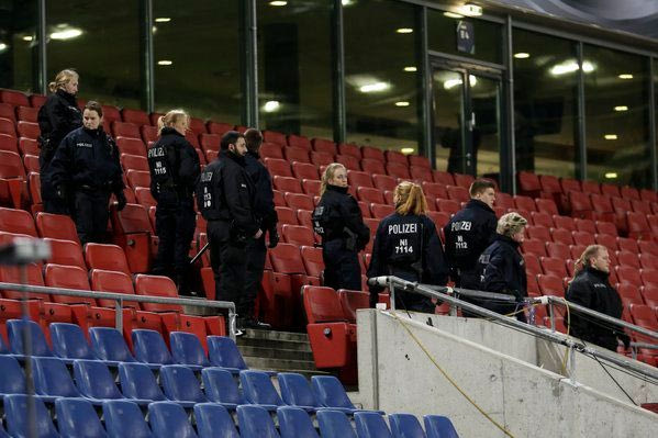 Η Γερμανική Αστυνομία έκλεισε όλες τις θύρες και πραγματοποίησε μεγάλη έρευνα, στη συνέχεια ζητήθηκε η εκκένωση του γηπέδου, προτού ανακοινωθεί η οριστική ματαίωσή του. Εκτός από την “HDI Arena”, η Αστυνομία προχώρησε στην εκκένωση της “TUI Arena”, στην οποία λάμβανε χώρα μία συναυλία. Αξίζει να σημειωθεί πως την αναμέτρηση επρόκειτο να παρακολουθήσει η Καγκελάριος της Γερμανίας, Άνγκελα Μέρκελ, καθώς κι η υπόλοιπη κυβέρνηση.
