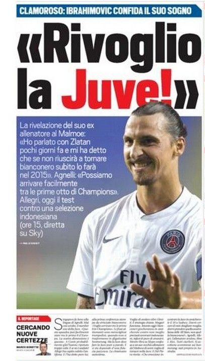 Επιθυμία επιστροφής στη Γιουβέντους έχει ο Ζλάταν Ιμπραχίμοβιτς, σύμφωνα με τα λεγόμενα του Σουηδού προπονητή Στέφαν Χάνσεν στην εφημερίδα "Tuttosport". Μάλιστα, τον έχει και στο πρωτοσέλιδό της.