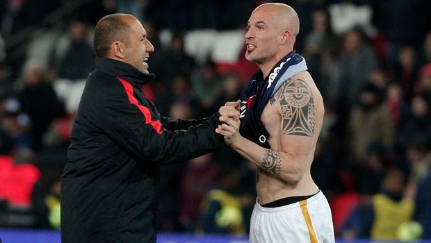 Monaco's Andrea Raggi, right, and head coach Leonardo Jardim, celebrate after their French League One soccer match against Paris Saint Germain, at the Parc des Princes stadium, in Paris, Sunday, March 20, 2016. (AP Photo/Thibault Camus) AP