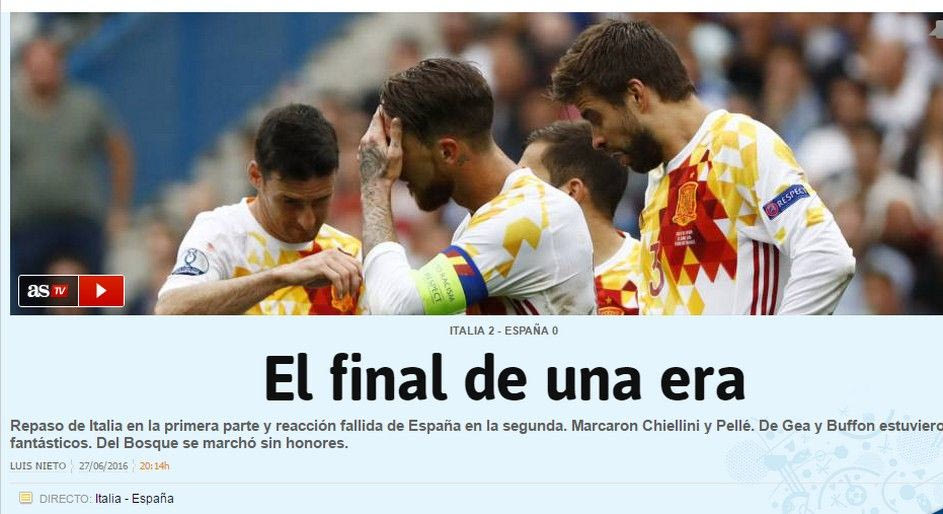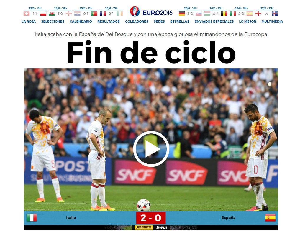 Η “Marca” έχει περίπου αυτόν τον τίτλο. “Fin de ciclo” αναφέρει η πρώτη, σε κυκλοφορία, αθλητική εφημερίδα της Ισπανίας στη διαδικτυακή της έκδοση. “Τελείωσε μία εποχή δόξας με τον αποκλεισμό από τη συνέχεια του Euro” συμπληρώνει.