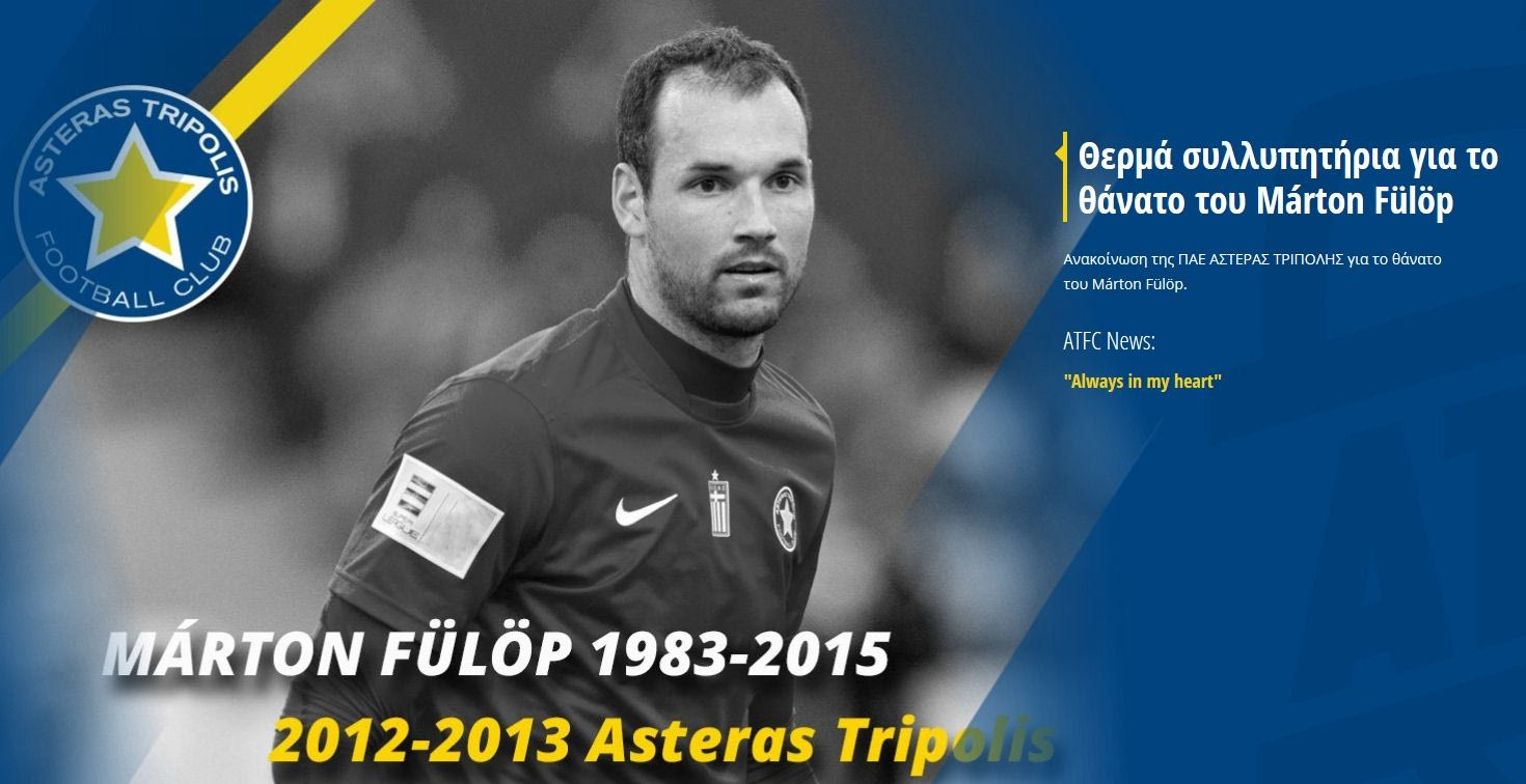 Η οικογένεια του ΑΣΤΕΡΑ ΤΡΙΠΟΛΗΣ εκφράζει τα θερμά της συλλυπητήρια για το θάνατο του Márton Fülöp. Ο Ούγγρος τερματοφύλακας αγωνίστηκε στον ΑΣΤΕΡΑ τη σεζόν 2012-2013 και αποτέλεσε βασικό μέλος της ομάδας η οποία πραγματοποίησε εξαιρετική πορεία και έφτασε στον Τελικό Κυπέλλου Ελλάδας το Μάιο του 2013.