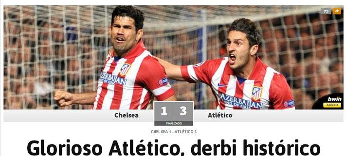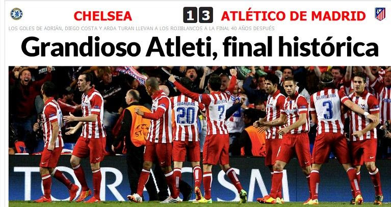 Marca: “Τεράστια Ατλέτικο, ιστορικός τελικός. Η Τσέλσι προηγήθηκε με τον Τόρες αλλά η Ατλέτικο απάντησε για να είναι στις 24 Μαϊου στη Μόσχα”.