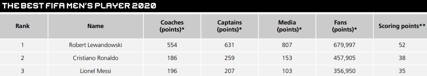 Τα αποτελέσματα της ετήσιας ψηφοφορίας των κορυφαίων της σεζόν περιλαμβάνουν πάντοτε μεγάλο ενδιαφέρον. Το βραβείο του The Best της FIFA απονεμήθηκε στον Ρόμπερτ Λεβαντόβσκι, ο οποίος βρέθηκε στην τελική τριάδα με Κριστιάνο Ρονάλντο και Λιονέλ Μέσι, όμως η νίκη του Πολωνού δεν ήταν ομόφωνη.