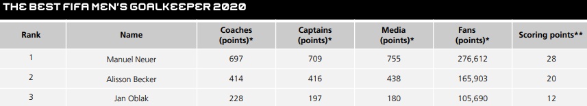 Ο Πολωνός νικητής του διαγωνισμού ψήφισε επίσης… περίεργα, αφού στη λίστα του χώρεσε μόνο ένας συμπαίκτης από την περσινή Μπάγερν, ο Τιάγκο. Ακολούθησε ένας αντίπαλος από τον τελικό του Champions League, ο Νεϊμάρ, και ο Ντε Μπράινε. Ο Φαν Ντάικ, εκπροσωπώντας την Ολλανδία ουσιαστικά εκπροσώπησε τη Λίβερπουλ, αφού επέλεξε πρώτα τον Μανέ, μετά τον Σαλάχ και αν ο Τιάγκο δεν είχε πάρει μεταγραφή στη Λίβερπουλ, ίσως να μην βρισκόταν στην 3η θέση. Δείτε αναλυτικά τι ψήφισαν οι αρχηγοί των κορυφαίων εθνικών ομάδων:
