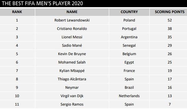 Ο Ρονάλντο νίκησε με μικρή διαφορά στην προσωπική μονομαχία τον Μέσι, χάνοντας μόνο στην ψηφοφορία των προπονητών από τον Αργεντινό, ενώ στην 4η θέση υπήρχε μια έκπληξη που τείνει να μην είναι έκπληξη. Ο Σαντιό Μανέ σάρωσε τις πρωτιές από χώρες της Αφρικής (Τόγκο, Μπενίν, ΛΔ Κονγκό κλπ.). Ο Μοχάμεντ Σαλάχ από την πλευρά του κατετάγη 6ος, αφού είχε κι αυτός έρεισμα τόσο εκεί, όσο και σε αραβόφωνες χώρες (Λίβανος, Συρία κλπ.). Αντιθέτως, ο Βίρτζιλ φαν Ντάικ ψηφίστηκε πρώτος κυρίως από… νησιώτες (πχ. Φίτζι, Αντίγκουα και Μπαρμπούντα κλπ.) και γι’ αυτό έμεινε στη 10η θέση.