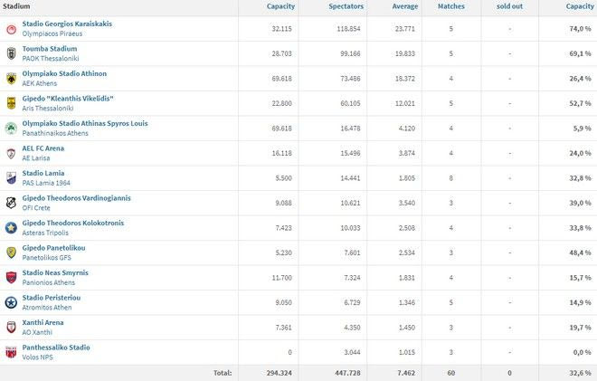 Σύμφωνα με στοιχεία του Transfermakt.com, ο Ολυμπιακός είναι η ομάδα με το μεγαλύτερο ποσοστό προσέλευσης φιλάθλων ανά παιχνίδι, ένα 74%, που μεταφράζεται σε μέσο όρο 23.771 φιλάθλων, για ένα γήπεδο που χωράει 32.115 άτομα. Ο ΠΑΟΚ βρίσκεται στη 2η θέση, με την Τούμπα να προσελκύει κατά μέσο όρο 19.833 οπαδούς, γεμίζοντας το 69% του σταδίου. Η χρήση του Ολυμπιακού Σταδίου από την ΑΕΚ μεταφράζεται σε μέσο όρο προσέλευσης 18.372 φιλάθλων, κάτι που μεταφράζεται σε 26,4% πληρωθέντων θέσεων έναντι 69.618 του συνόλου. Ο Παναθηναϊκός συγκεντρώνει μόλις 4.120 θεατές ανά παιχνίδι στο ίδιο γήπεδο, δηλαδή καλύπτει το 5,9% του συνόλου των θέσεων του ΟΑΚΑ. Ακόμα μεγαλύτερη ερημιά συναντάμε και στο γήπεδο της Νέας Σμύρνης, όπου μόλις 1.831 πιστοί συνδράμουν στο δύσκολο έργο του Πανιωνίου να παραμείνει στην κατηγορία, σε ένα γήπεδο 11.700 θέσεων. Στο Περιστέρι, η κατάσταση είναι ακόμα χειρότερη, μόλις 1.300 φίλοι του Ατρομήτου πηγαίνουν σταθερά στο γήπεδο (χωρητικότητας 9.050 θέσεων).