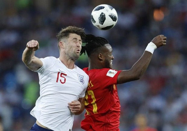 England's Gary Cahill, left, Belgium's Michy Batshuayi challenge for the ball during the group G match between England and Belgium at the 2018 soccer World Cup in the Kaliningrad Stadium in Kaliningrad, Russia, Thursday, June 28, 2018. (AP Photo/Hassan Ammar) AP Photo/Hassan Ammar