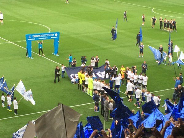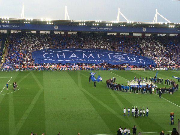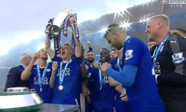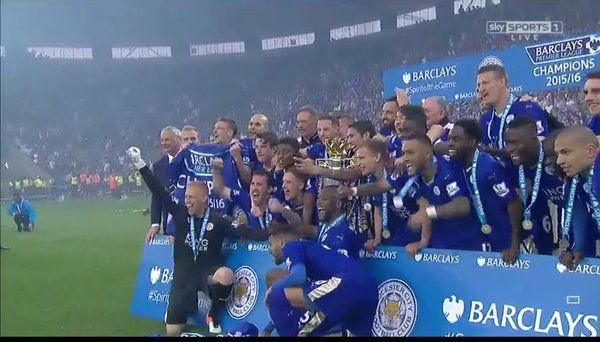 Μετά το τέλος του ματς έφτασε επιτέλους η στιγμή που τόσο καιρό ονειρεύονταν οι φίλαθλοι της Λέστερ. Η εξέδρα στήθηκε στο κέντρο του γηπέδου και ένας ένας παίκτης των “αλεπούδων” ανέβαινε για να παραλάβει το μετάλλιό του.
