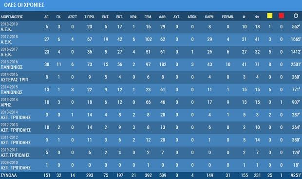 Μόνο τη φετινή σεζόν, σε έξι παιχνίδια Super League που έχει αγωνιστεί για 562 λεπτά, ο διεθνής επιθετικός μετράει τρία γκολ. Το τελευταίο εξ αυτών με την τελική προσπάθεια με κεφαλιά, στο 90′ του ντέρμπι κόντρα στον Ολυμπιακό.