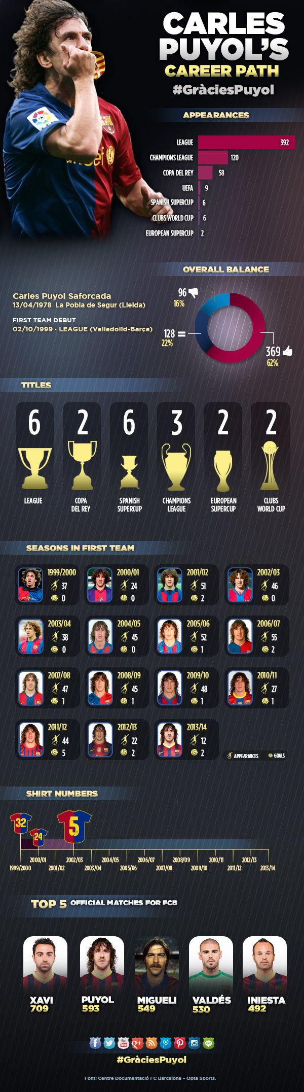 Η Μπαρτσελόνα, εξάλλου, δημοσίευσε ένα γράφημα, στο οποίο απεικονίζεται όλη η καριέρα του Κάρλες Πουγιόλ (τίτλοι, συμμετοχές, ποσοστά κτλ.) σε αριθμούς.