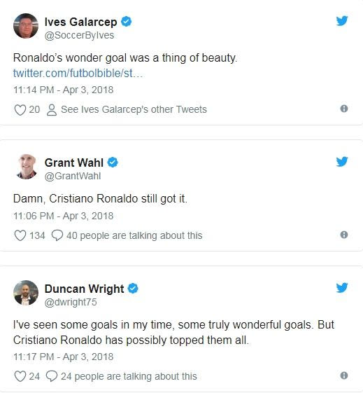 Ένας εξ’ αυτών έγραψε: “Στην εποχή μου έχω δει κάποια απίστευτα γκολ, αλλά αυτό του Ρονάλντο τα ξεπερνάει όλα”, ενώ ένας άλλος είπε χαρακτηριστικά: ” Είναι πουλί; Είναι αεροπλάνο; Όχι! Είναι ο Κριστιάνο Ρονάλντο”.