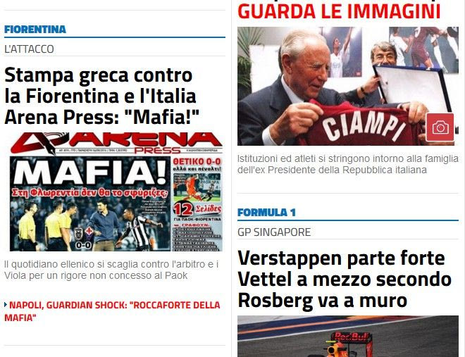 Πρωτοσέλιδο ελληνικής αθλητικής εφημερίδας που κάνει λόγο για... Μαφία με αφορμή την μη υπόδειξη πέναλτι υπέρ του ΠΑΟΚ στο φινάλε του αγώνα με την Φιορεντίνα δεν έμεινε ασχολίαστο από τους Ιταλούς. Διαβάστε την αντίδρασή τους.
