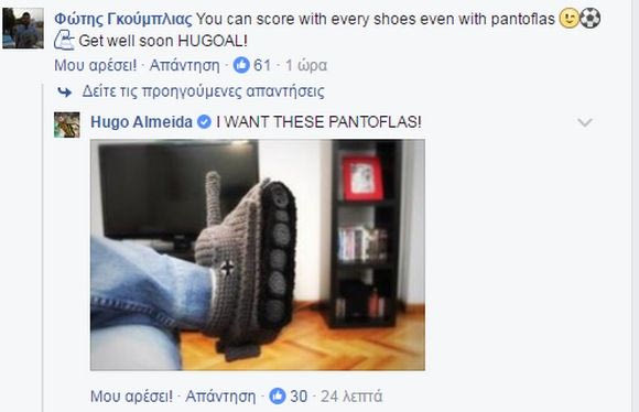 Με αφορμή τα καινούργια του παπούτσια που ανέβασε στο facebook, ένας φίλος της ΑΕΚ του έγραψε πως… ” μπορείς να σκοράρεις ακόμα και με παντόφλες. Γίνε σύντομα καλά”.
