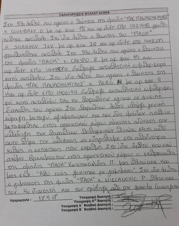 «Στο 53ο λεπτό του αγώνα ο παίκτης της ομάδας ΠΑΕ Παναθηναϊκός Κουλιμπαλί με τον αριθμό φανέλας 78 και αρ. δελτ. ΕΠΟ 1421935 γρονθοκόπησε αντίπαλο. Στο ίδιο λεπτό ο παίκτης του ΠΑΟΚ κ. Σακχόφ με αριθμό φανέλας 28 και αρ. δελτ. ΕΠΟ 1448271 γρονθοκόπησε αντίπαλο.