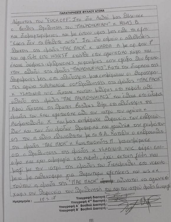 Κατόπιν ο εκπρόσωπος της ομάδας ΠΑΕ ΠΑΟΚ κ. Κωνσταντινίδης Π. μας ενημέρωσε ότι ο προπονητής της ομάδας κ. Βλάντιμιρ Ιβιτς φέρει σκίσιμο και εχει αιμορραγία στο κεφάλι, έχει έντονη ζάλη και μαζί με τον ιατρό της ομάδας του διεκομίσθη στο νοσοκομείο με ασθενοφόρο για περαιτέρω εξετάσεις και ως εκ τούτου η ομάδα της ΠΑΕ ΠΑΟΚ αδυνατεί να αγωνιστεί χωρίς την παρουσία του προπονητή του και του ιατρού ης ομάδας. Λαμβάνοντας υπόψιν τα παραπάνω γεγονότα, την ενημέρωση των παρατηρητών αγώνα, βάσει του άρθρου 15, παρ. 3. Εδ. Β. 6 αποφάσισα την οριστική διακοπή του αγώνα. Ουδεμία άλλη παρατήρηση».