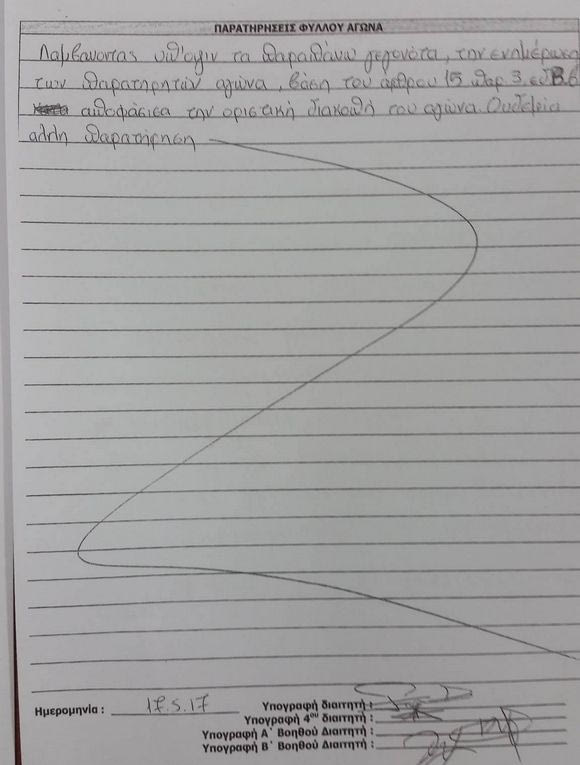 Ο διαιτητής της επεισοδιακής αναμέτρησης Παναθηναϊκού – ΠΑΟΚ, η οποία δεν τελείωσε ποτέ, είχε δύσκολο έργο με το φύλλο αγώνα κι από ότι φαίνεται του πήρε αρκετή ώρα μέχρι να το συντάξει. Λογικό να είναι αρκετά προσεκτικός στις διατυπώσεις του αφού το … τρίτο ημίχρονο θα έχει πολύ ψωμί και θα συνεχιστεί στις αίθουσες των τακτικών δικαστών της Λίγκα.