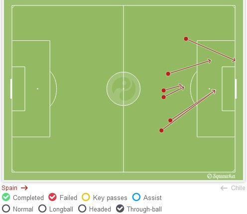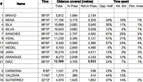Όπως και η Ισπανία, έτσι κι η Χιλή επιτέθηκε με ελάχιστους παίκτες. Μόλις 3 βασικοί Χιλιανοί πέρασαν πάνω από το 35% του χρόνου τους στο μισό γήπεδο του αντιπάλου, σε ένα reactive football που χρειάζεται πολλές δυνάμεις, ιδιαίτερα εάν απέναντί σου έχεις την Ισπανία.