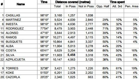 Είναι χαρακτηριστικό ότι μόλις 4 παίκτες της αρχικής σύνθεσης του Ντελ Μπόσκε πέρασαν πάνω από το 50% του χρόνου τους στο μισό γήπεδο του αντιπάλου, παρότι η Ισπανία είχε την κατοχή της μπάλας.