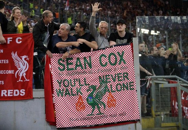 Fans hold a banner in English and Italian in support of Liverpool fan Sean Cox during the Champions League semifinal second leg soccer match between Roma and Liverpool at the Olympic Stadium in Rome, Wednesday, May 2, 2018. Cox has been in an induced coma since being attacked before the first leg match in Liverpool. (AP Photo/Alessandra Tarantino) AP/Alessandra Tarantino