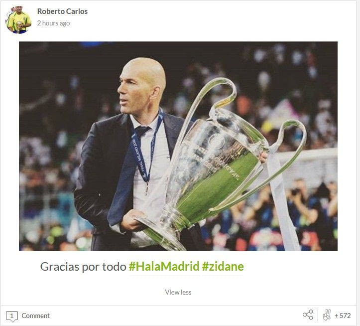“Είδωλο της ιδέας που πρεσβεύει η Ρεάλ. Το Μπερναμπέου παραδόθηκε στα πόδια σου ως παίκτης και ξετρελάθηκε μαζί σου και ως προπονητής. Ο θρύλος σου παραμένει αιώνιος, Ζιντάν”, ήταν το σχόλιο του Βραζιλιάνου παλαίμαχου άσου στο Twitter, ο οποίος μέσω μίας άλλης πλατφόρμας κοινωνικής δικτύωσης (Vippter) ανέβασε φωτογραφία του “Ζιζού” όπου τον δείχνει να προτρέπει κάποιους να σιωπήσουν.