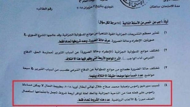 Το είδαμε κι αυτό! Το μαρκάρισμα-μαρς του Ράμος στον Μοχάμεντ Σαλάχ που τον έθεσε εκτός τελικού Champions League από το 30 λεπτό ήταν από τα ερωτήματα σε τεστ νομικής του Πανεπιστημίου της Δαμασκού.