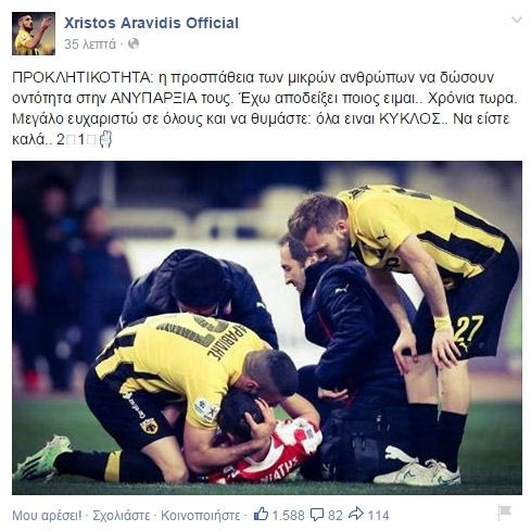 Η πιο όμορφη στιγμή του ντέρμπι καταγράφηκε στο 52ο λεπτό, όταν μετά από τον τραυματισμό του Γιάννη Μανιάτη, ο Χρήστος Αραβίδης δεν έφυγε από πάνω του μέχρι τη στιγμή που το φορείο τον μετέφερε εκτός αγωνιστικού χώρου. Ο επιθετικός της ΑΕΚ με σημερινό (12/03) μήνυμά του ευχαριστεί τον κόσμο για την υποστήριξη, ενώ αφήνει αιχμές για τη συμπεριφορά των ανθρώπων του Ολυμπιακού.