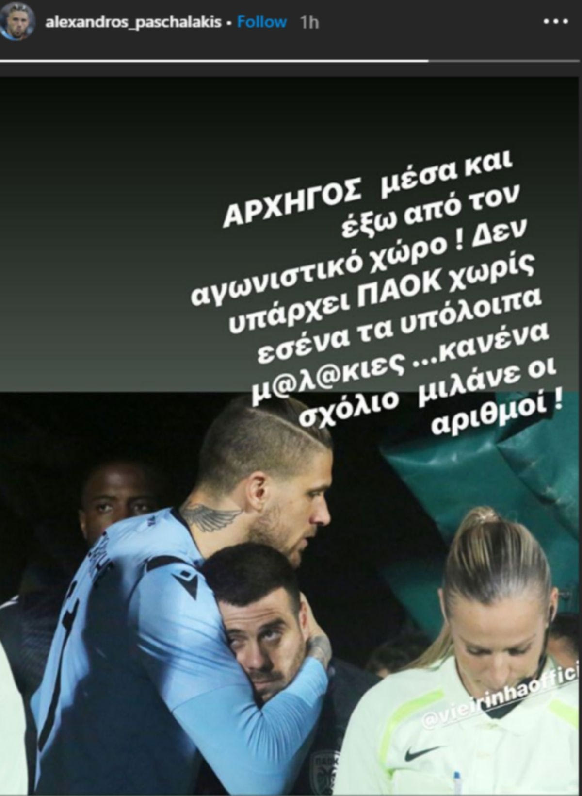 Αρχηγός μέσα και έξω από τον αγωνιστικό χώρο. Δεν υπάρχει ΠΑΟΚ χωρίς εσένα τα υπόλοιπα μ@λ@κιες. Κανένα σχόλιο μιλάνε οι αριθμοί“, ήταν το instagram story του διεθνούς γκολκίπερ, με ξεκάθαρες αιχμές σε όσους εντός κι εκτός ομάδας αμφισβητούν την αναγκαιότητα της παρουσίας του Βιεϊρίνια στο ρόστερ της νέας σεζόν.
