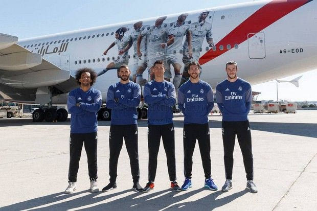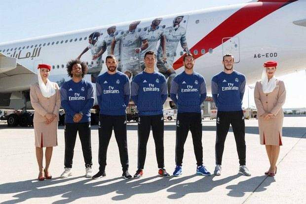 Κάπως έτσι σκέφτηκαν οι άνθρωποι των “μερένγκες” και έτσι προχώρησαν στην παρουσίαση του νέου αεροπλάνου της ομάδας, ενός 1380 της εταιρίας “Dubai Emirates” (η εταιρία “Emirates” είναι βασικός χορηγός της Ρεάλ από το 2013), με τους Κριστιάνο Ρονάλντο, Σέρχιο Ράμος, Γκάρεθ Μπέιλ, Καρίμ Μπενζεμά και Μαρσέλο να είναι παρόντες στην παρουσίασή του.