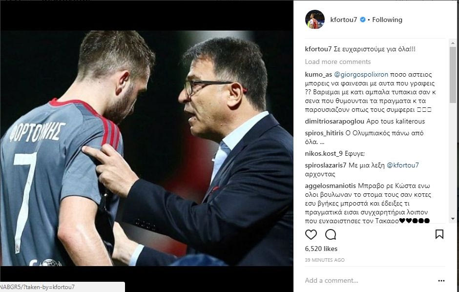 Ο Ολυμπιακός δεν ανέβασε στα social media την είδηση της λύσης της συνεργασίας με τον Τάκη Λεμονή και μία μέρα αργότερα ο Κώστας Φορτούνης τον ευχαρίστησε στο λογαριασμό του στο Instagram, με τα σχόλια να παίρνουν... φωτιά. Πήραν θέση Ταχτσίδης, Κούτρης!