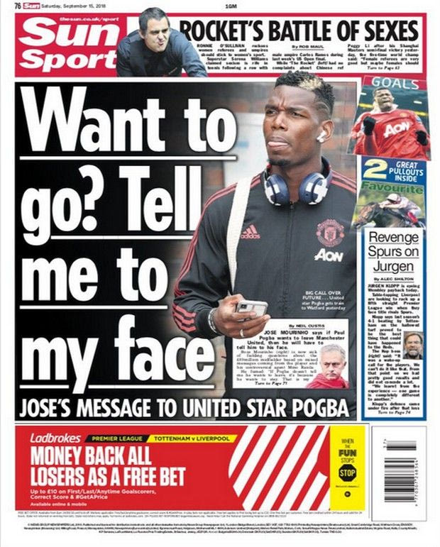Δεν φτάνει στον Ζοζέ Μουρίνιο η κάκιστη εκκίνηση της Μάντσεστερ Γιουνάιτεντ στη φετινή Premier League με έξι πεταμένους βαθμούς (ήττες από Μπράιτον και Τότεναμ) στις τέσσερις πρώτες αγωνιστικές, είναι υποχρεωμένος να διαχειριστεί όσο γίνεται πιο… αναίμακτα το “ζήτημα Πογκμπά”.
