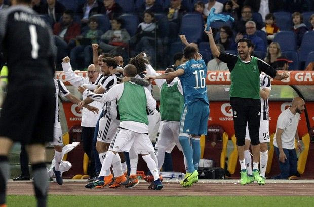 Juventus players celebrate at the end of the Serie A soccer match between Roma and Juventus, at the Rome Olympic stadium, Sunday, May 13, 2018. The match ended in a scoreless draw and Juventus won record-extending seventh straight Serie A title. (AP Photo/Gregorio Borgia) AP Photo/Gregorio Borgia