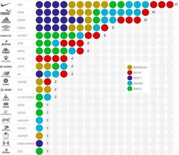 Η Nike διαθέτει 17 ομάδες στα 5 μεγάλα πρωταθλήματα με την Puma να την ακολουθεί με 14 και την Adidas να συμπληρώνει την… αγία τριάδα των αθλητικών ειδών με 13 ομάδες.
