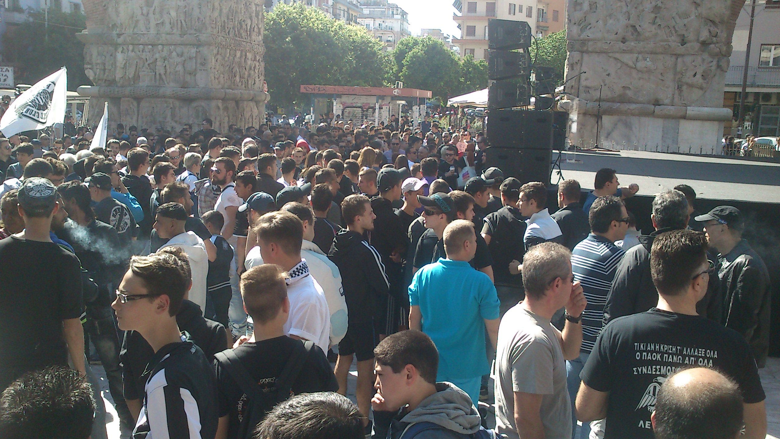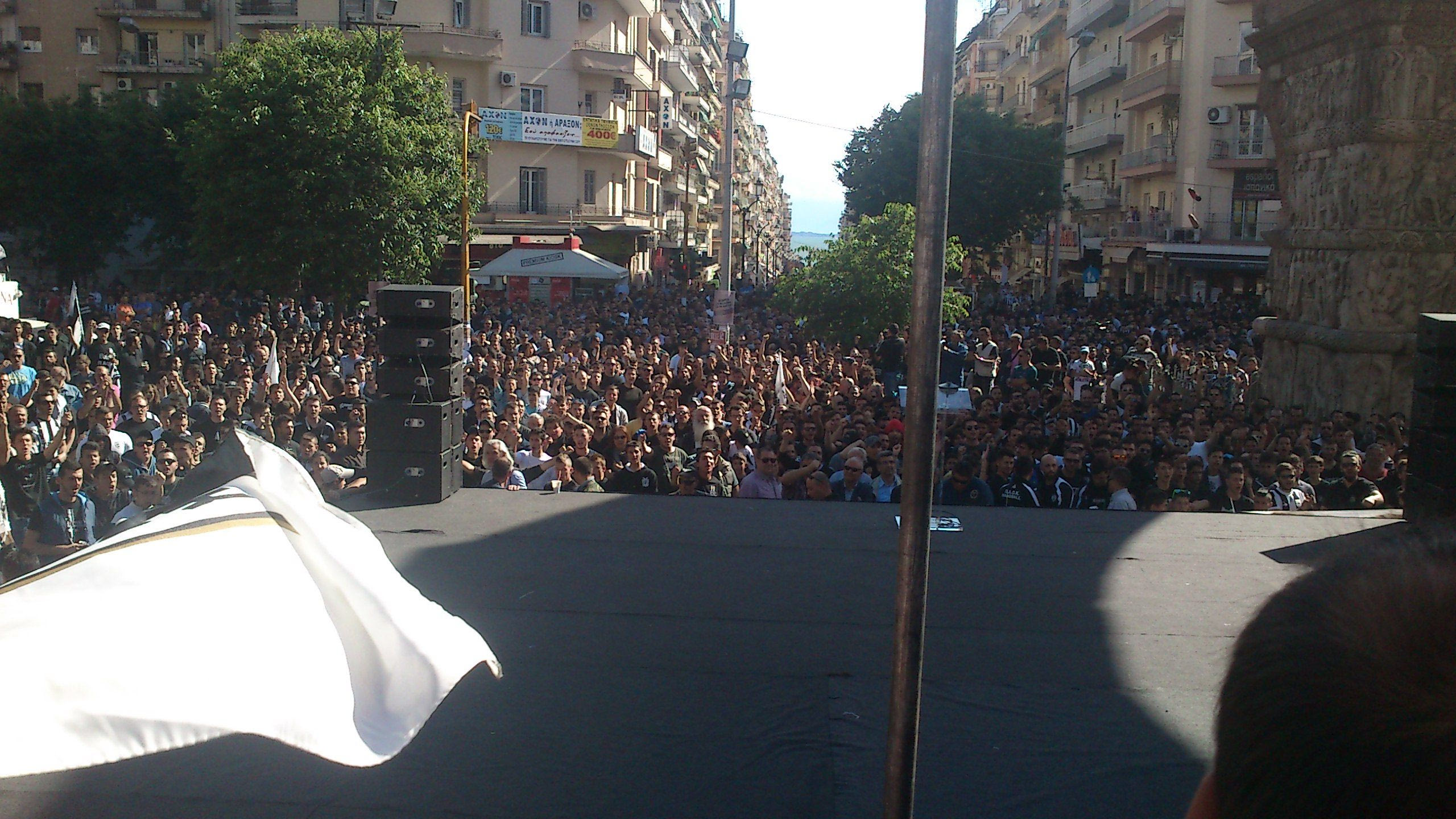 Θανάσης Κατσαρής (πρόεδρος ΑΣ ΠΑΟΚ): “Φίλες και φίλοι του ΠΑΟΚ το σημερινό συλλαλητήριο, η σημερινή συγκέντρωση στέλνει το μήνυμα σε όλους ότι ο ΠΑΟΚ είναι εδώ ενιαίος και δυνατός. Όλοι μαζί θα αγωνιστούμε για τα συμφέροντα του ΠΑΟΚ. Δεν θα ανεχθούμε άλλες αποφάσεις, δεν θα ανεχθούμε άλλο αυτό που γίνεται εις βάρος της ομάδας. Δεν γίνεται να κρύβονται πίσω από το αυτοδιοίκητο και να κάνουν αυτά που κάνουν, με τον ΠΑΟΚ μπροστάρη θα έρθει η ισονομία στο ελληνικό ποδόσφαιρο. Οι άλλοι θέλουν να πάνε στην Ευρώπη, εμείς είμαστε η Ευρώπη, ο λαός του ΠΑΟΚ είναι η Ευρώπη. Προσπαθούν με αποφάσεις που δεν έχουν καμία βάση να εμποδίσουν τον ΠΑΟΚ να εκπροσωπήσει την Ελλάδα στην Ευρώπη. Ηρθε η ώρα, βρισκόμαστε όλοι εδώ ενωμένοι, πρώτη φορά βρισκόμαστε όλοι εδώ ενωμένοι. Πρώτη φορά θα διεκδικήσουμε τα δικαιώματά μας. Το νερό μπήκε στο αυλάκι. Οι αρχές του ποδοσφαίρου παίρνουν το μήνυμα. Μας έχουν υποσχεθεί εμείς όμως κρατάμε μικρό καλάθι. Πρέπει να ξεφύγουμε από τις υποσχέσεις και τα θα και να πάμε στην ουσία. Εχουμε την δέσμευση ότι θα δοθεί λύση στα δύο θέματα (χρεών και Θέρμης). Η λύση θα δοθεί για όλους, ο ΠΑΟΚ θα είναι πάλι μπροστάρης. Στο θέμα των χρεών ο ΠΑΟΚ πάλι δίνει λύση, γιατί ρυθμίζοντας τα χρέη του ΠΑΟΚ θα δοθεί λύση και για όλους όσους χρωστάνε. Είναι αδιανόητο να δίνουμε λεφτά και να μην τα παίρνουν. Θέλει ο μεγαλομέτοχος να κάνει επενδύσεις, θέλει να βοηθήσει την χώρα μας. Δεν είναι δυνατόν να γίνονται εξωθεσμικές παρεμβάσεις και να μην επιτρέπουν να προχωρήσουν τα έργα. Πρέπει σήμερα να στείλουμε το μήνυμα ότι θέλουμε λύση”.