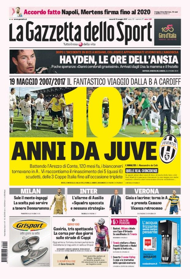 “10 χρόνια Γιούβε”, είναι ο τίτλος στο πρωτοσέλιδο (στα αριστερά υπάρχει φωτογραφία με τους πανηγυρισμούς του 2007 για την επιστροφή στη μεγάλη κατηγορία και στα δεξιά από την κατάκτηση του Coppa Italia του 2017), με την εφημερίδα να προσθέτει: