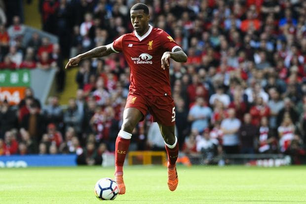Liverpool's Georginio Wijnaldum plays the ball during the English Premier League soccer match between Liverpool and Manchester United at Anfield, Liverpool, England, Saturday, Oct. 14, 2017. (AP Photo/Rui Vieira) AP Photo/Rui Vieira