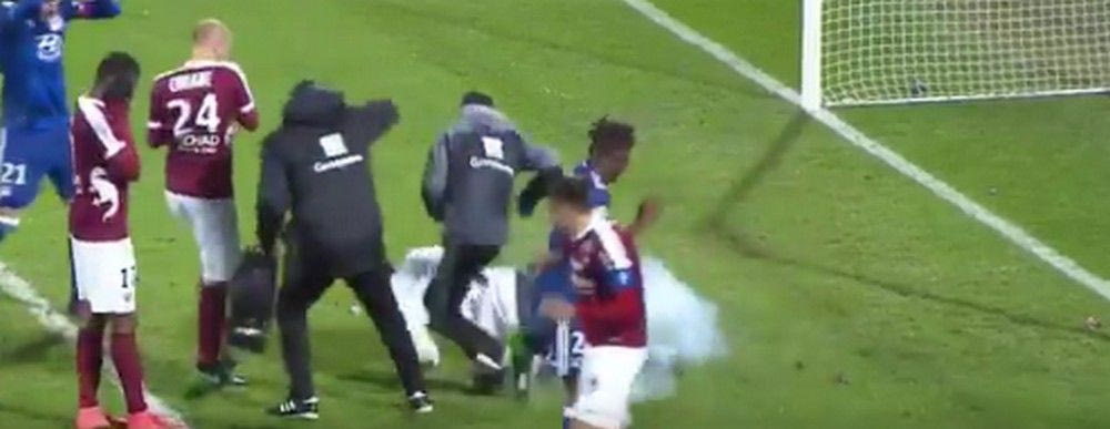 Στόχος των οπαδών της Μετς έγινε ο Άντονι Λόπες της Λιόν, ο οποίος δέχθηκε δύο κροτίδες, με αποτέλεσμα το ματς να διακοπεί.