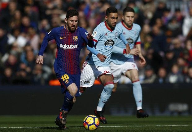 FC Barcelona's Lionel Messi, left, controls the ball during a Spanish La Liga soccer match between FC Barcelona and Celta Vigo at the Camp Nou stadium in Barcelona, Saturday, Dec. 2, 2017. (AP Photo/Manu Fernandez) AP