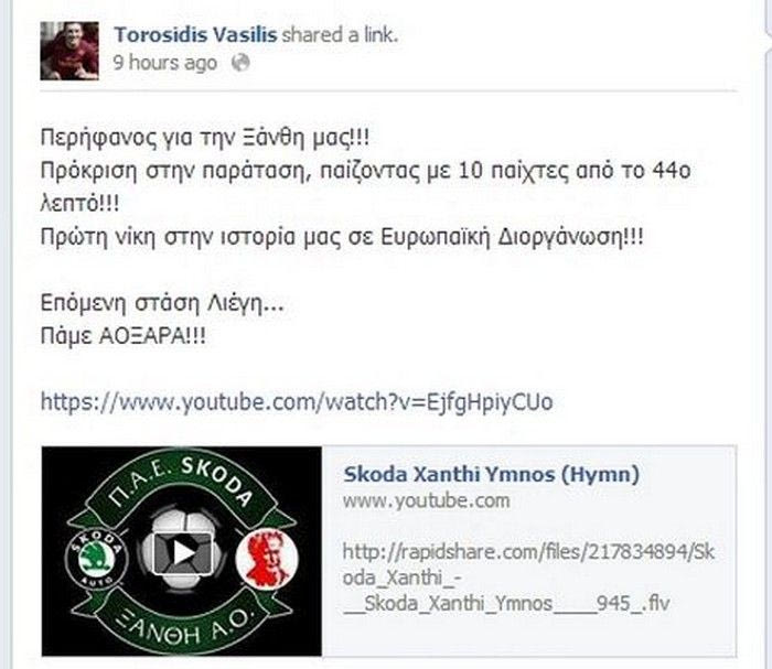 Η Ξάνθη πανηγύρισε την πρώτη της νίκη στη σύντομη ευρωπαϊκή ιστορία της και ο Βασίλης Τοροσίδης δήλωσε περήφανος για την ομάδα με την οποία αναδείχθηκε και αγωνίστηκε για 5 χρόνια.