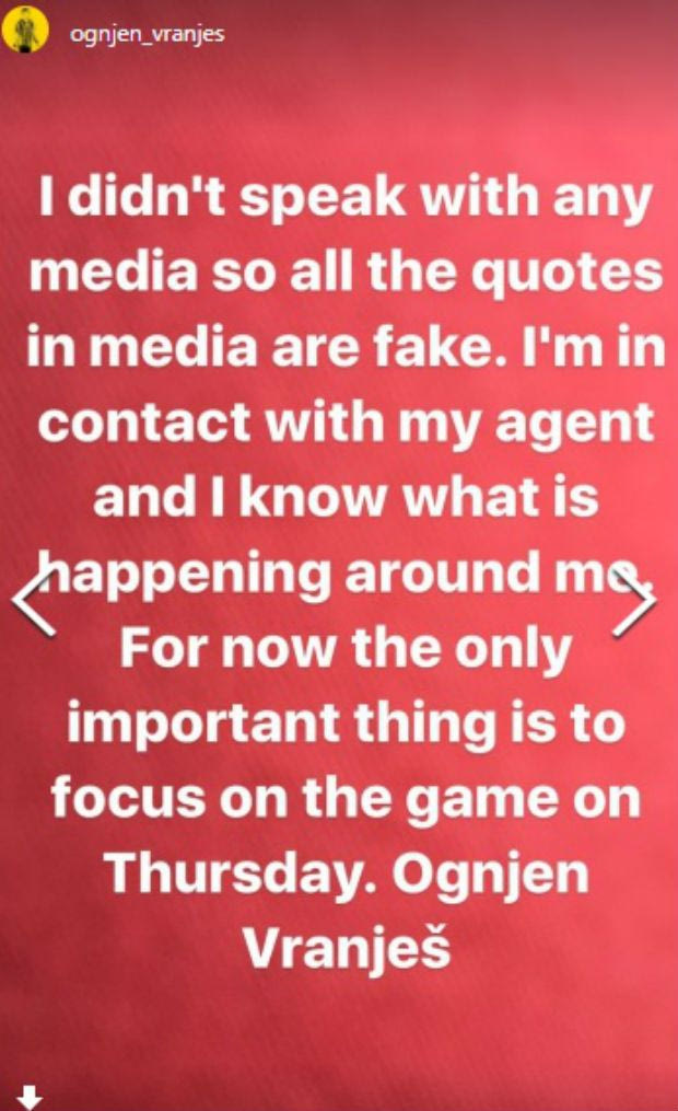 Κατηγορηματική διάψευση μέσω instagram από τον Ογκνιέν Βράνιες σχετικά με τις δηλώσεις που φέρεται να έχει κάνει σε βοσνιακό Μέσο, σημειώνοντας ότι έχει πρόταση από την Κρίσταλ Πάλας και την σκέφτεται μάλιστα πολύ σοβαρά.