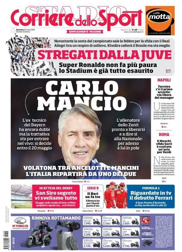 Φυσικά, όλα τα λεφτά στην σημερινή Corriere dello Sport είναι το πρώτοσελιδό της όπου έχει ένα πρόσωπο που είναι μισός Αντσελότι και μισός Μαντσίνι…