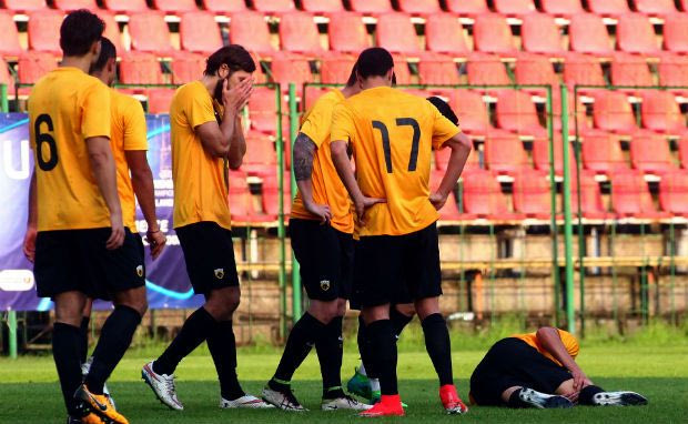 Οι συμπαίκτες του μαζεύτηκαν γύρω του με τους περισσότερους να μην αντέχουν να βλέπουν τον νεαρό Γαλανόπουλο να σφαδάζει στο χορτάρι.