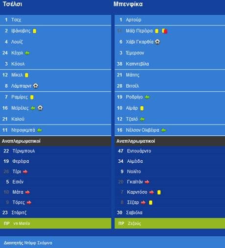 Κίτρινες κάρτες: 38′ Ιβάνοβιτς, 44′ Ραμίρες, 79′ Μίκελ – 19′ Καρντόσο, 21′ Περέιρα, 21′ Σέζαρ, 27′ Αϊμάρ