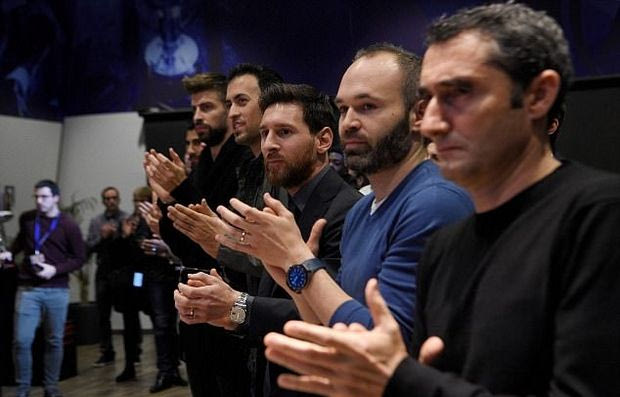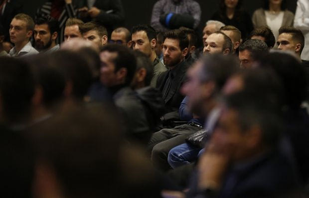 Στην αίθουσα, που ήταν γεμάτη από φωτογράφους και δημοσιογράφους, δήλωσαν “παρών” τόσο ο Ερνέστο Βαλβέρδε, όσο και οι Μέσι, Ινιέστα, Πικέ και Μπουσκέτς (οι αρχηγοί των “μπλαουγκράνα”), με τις αγκαλιές του Μέσι και του Ινιέστα προς τον Μαστσεράνο να είναι “όλα τα λεφτά”