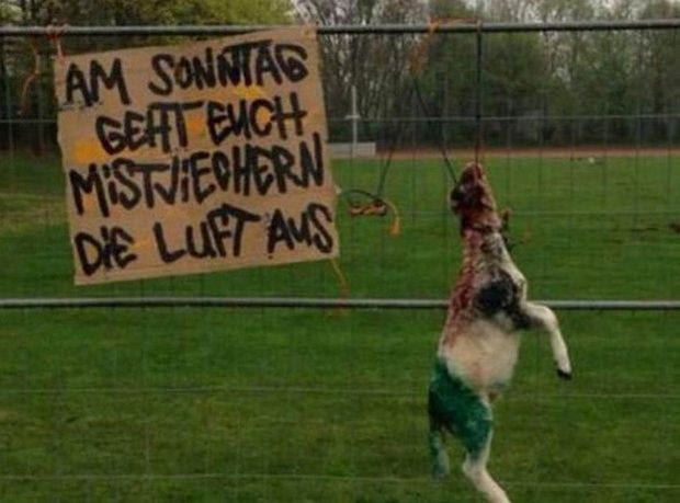 Συγκεκριμένα λίγα μέτρα μακριά από το προπονητικό κέντρο του Ανόβερου κρέμασαν ένα σκοτωμένο αμνοερίφιο, έβαψαν μέρος του στα χρώματα των αντιπάλων τους και έγραψαν “την Κυριακή θα σας πνίξουμε π… γιοι”.