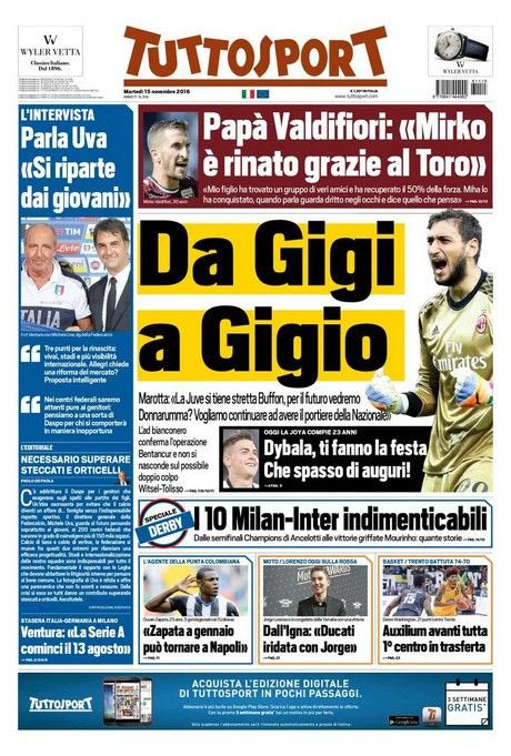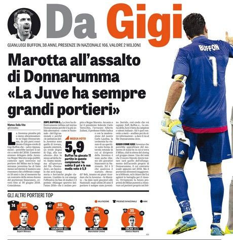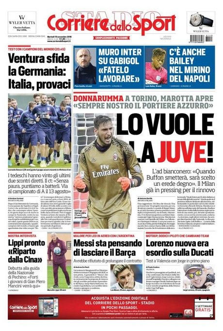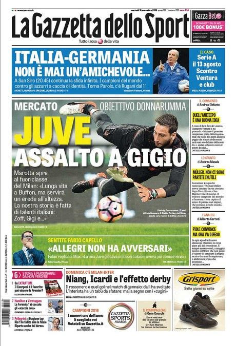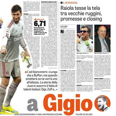 “Στόχος ο Ντοναρούμα. Επίθεση της Γιούβε στον Τζίτζο”, είναι ο τίτλος της “Gazzetta dello Sport”, “Τον θέλει η Γιούβε”, εκείνος της “Corriere dello Sport” ενώ η (τορινέζικη) “Tuttosport” τιτλοφορείται: “Από τον Τζίτζι στον Τζίτζο”.