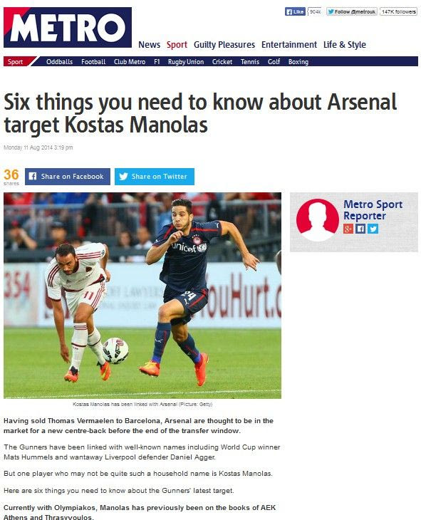 Ο Κώστας Μανωλάς φέρεται να αποτελεί υποψήφιο μεταγραφικό στόχο της Άρσεναλ και η ιστοσελίδα "metro.co.uk" ανέλαβε να τον "συστήσει" στο βρετανικό κοινό.