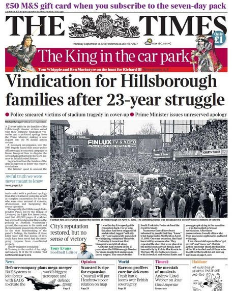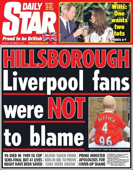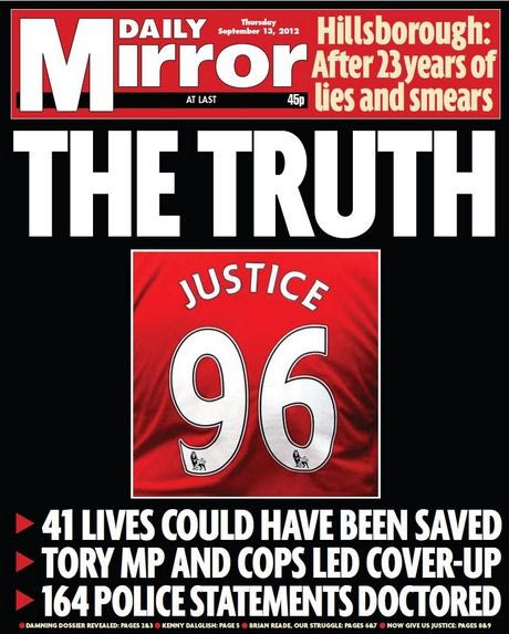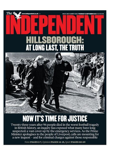 Η αποκατάσταση της πραγματικότητας για την τραγωδία του "Χίλσμπορο" έγινε κεντρικό θέμα στα βρετανικά ταμπλόιντς. Με τίτλους "αλήθεια" και "δικαιοσύνη" οι εφημερίδες της χώρας αναφέρονται στο σχέδιο συγκάλυψης που για 23 χρόνια κράτησε στο σκοτάδι τα πραγματικά γεγονότα.