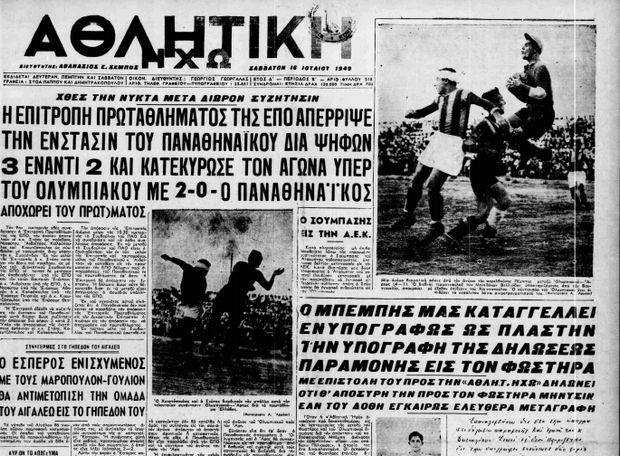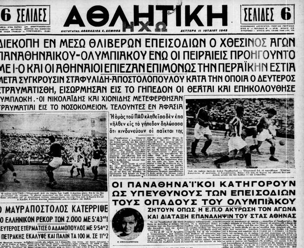 Η τελική φάση του πρωταθλήματος 1948-49 (ακόμη ο εμφύλιος δεν είχε τελειώσει) περιελάμβανε τρεις ομάδες: Παναθηναϊκός από την Αθήνα, Ολυμπιακός από τον Πειραιά και Άρης από την Θεσσαλονίκη. Οι ‘πράσινοι’ είχαν επικρατήσει των Πειραιωτών με 3-2 στη Λεωφόρο, ενώ Άρης και Ολυμπιακός σε ένα τρομερό ματς στη Θεσσαλονίκη είχαν αναδειχθεί ισόπαλοι 4-4. Οι ‘ερυθρόλευκοι’ είχαν δυο σερί ματς στο Φάληρο. Πρώτα με τον Παναθηναϊκό και μετά με τον Άρη. Στις 10 Ιουλίου 1949, το Ποδηλατροδρόμιο που φιλοξένησε το ‘αιώνιο’ ντέρμπι, έγινε… γης μαδιάμ. Την επομένη (11/7) η Αθλητική Ηχώ, που τότε εκδιδόταν τρεις φορές την εβδομάδα (Δευτέρα, Πέμπτη, Κυριακή) κυκλοφορεί ως εξής, μεταφέροντας την οργιώδη εξέλιξη του ντέρμπι στο χαρτί