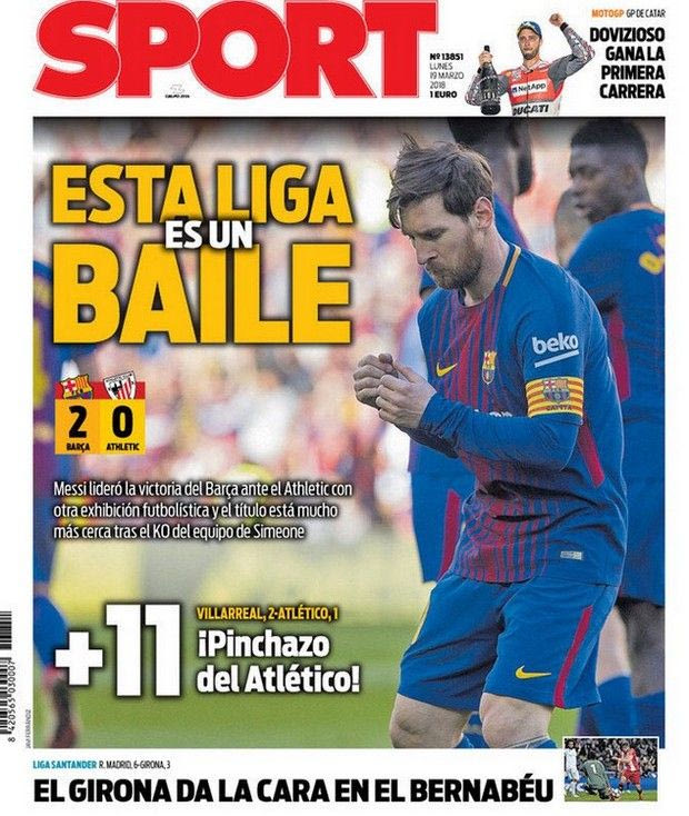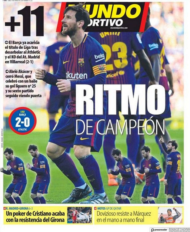 Ο Λιονέλ Μέσι οδηγεί την Μπαρτσελόνα του Ερνέστο Βαλβέρδε προς τον τίτλο στην La Liga... χορεύοντας και τα καταλανικά ΜΜΕ δεν έχασαν την ευκαιρία μετά το 2-0 επί της Μπιλμπάο να ακολουθήσουν στο ρυθμό του μέσα από τα εντυπωσιακά πρωτοσέλιδά τους. Διαβάστε το story!